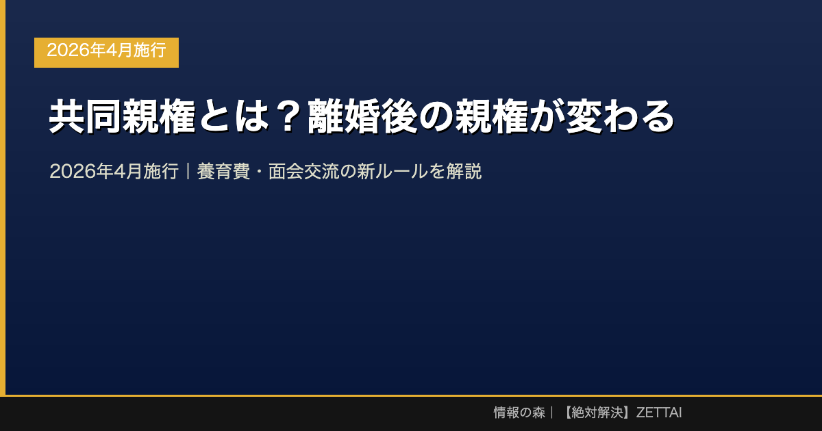 2026年4月1日、日本の民法が大きく改正されます。その中で最も注目されるのが「共同親権」の導入です。離婚後の親権のあり方が変わることで、多くの家庭に影響を与える重要な法改正となります。本記事では、共同親権制度の基本から実際の適用方法まで、わかりやすく解説します。
