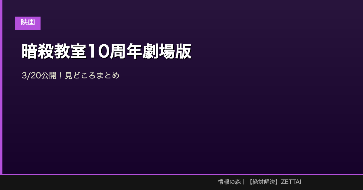 あの暗殺教室が帰ってきます!TVアニメ放送10周年を記念した劇場版「暗殺教室」みんなの時間が2026年3月20日に公開されます。ファン待望の新作映画の見どころをまとめました。