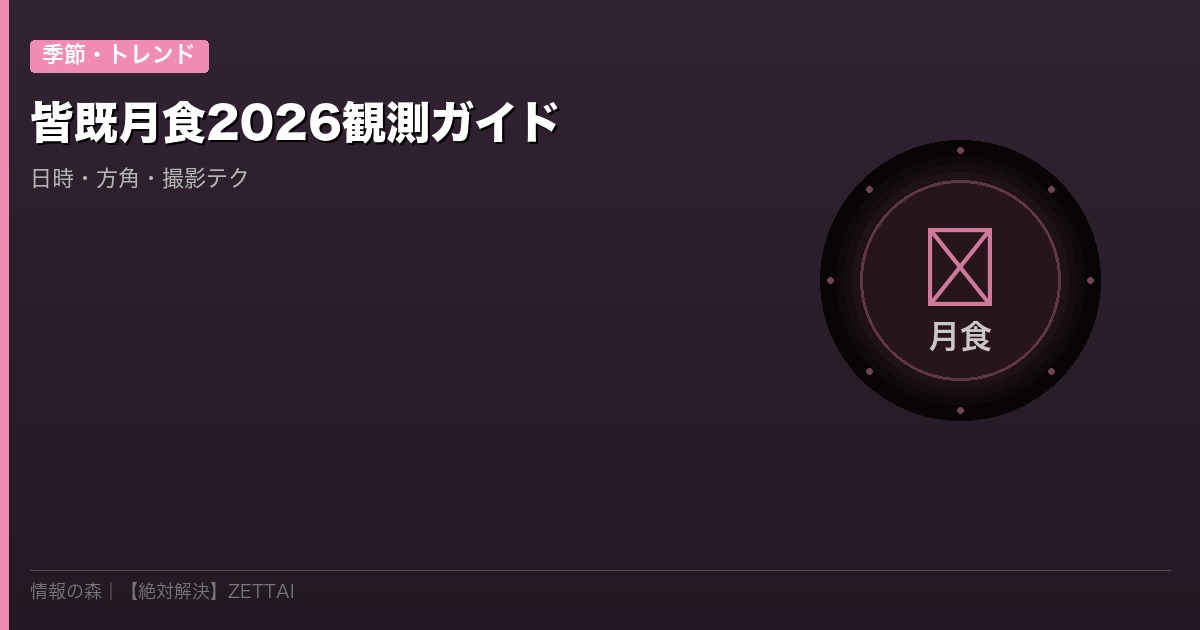 2026年3月、ついに日本全国で皆既月食が観測できます。「何時から見ればいいの?」「スマホでも撮れるの?」そんな疑問を抱えているあなたに、この記事では観測の日時・方角から撮影テクニックまで、知っておくべき情報をすべてまとめました。