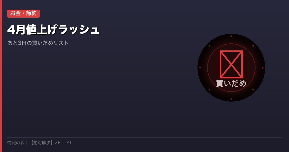 2026年4月1日から食品3593品目が一斉値上げされます。あと3日しかありません。マヨネーズ、食用油、カップ麺、調味料、ビールなど、日常的に使うものばかりが対象です。