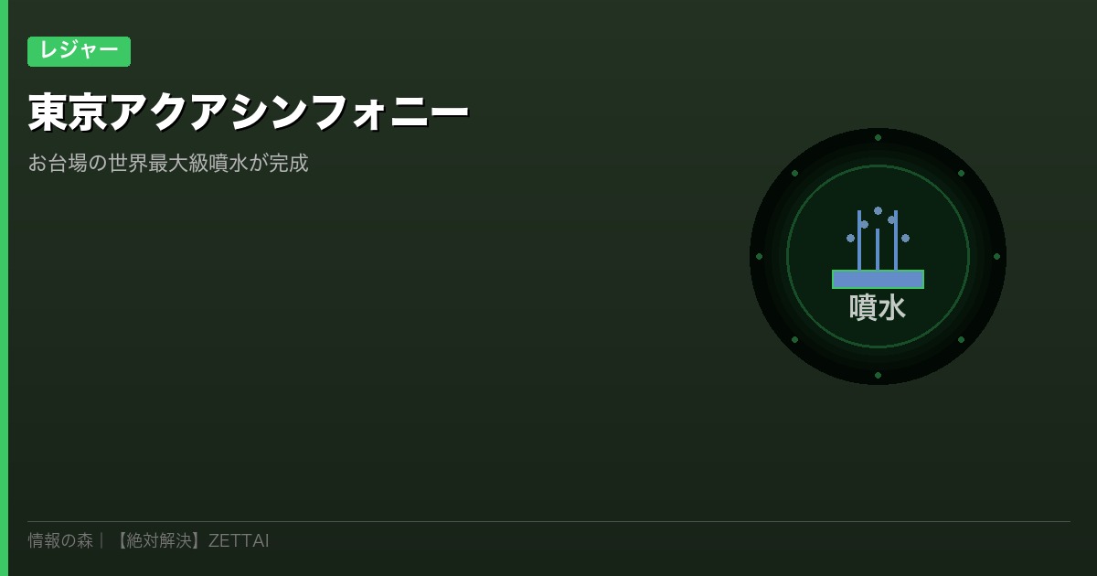 世界最大級のスケールで東京湾を彩る「東京アクアシンフォニー」。26億円をかけて完成した噴水ショーは、あなたの想像をはるかに超える迫力です。