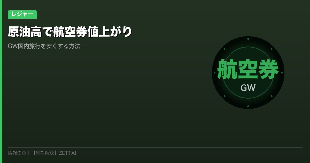 2026年3月、原油価格が1バレル103ドルを超え、燃油サーチャージが大幅に上昇しています。GW(ゴールデンウィーク)の国内旅行を計画している方にとって、航空券の値上がりは家計に痛い出費です。