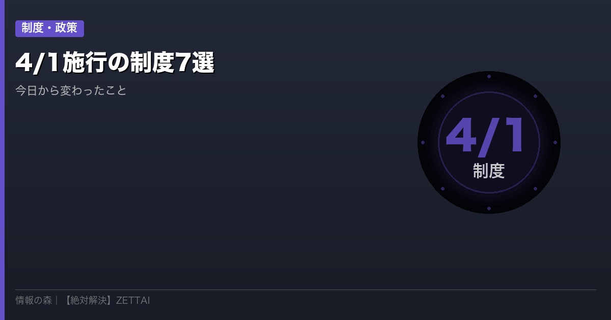 この記事では、4月1日に施行された新制度7選を初日の反応や現場の混乱も含めてレポートします。世帯構成別の家計影響シミュレーターも用意しましたので、あなたの家計にいくらプラス(またはマイナス)になるかチェックしてみてください。