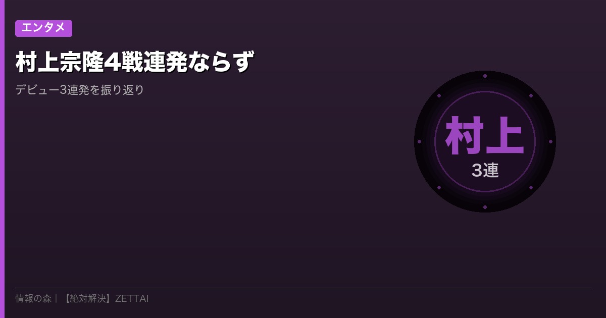 「村上宗隆のデビュー3戦連続ホームランが止まった…」。4戦目での連発ストップに残念がる声がSNSで広がりましたが、冷静に考えてください。MLB史上4人目のデビュー3戦連発という記録自体がとんでもない偉業です。