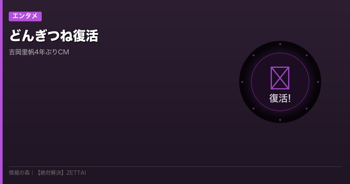 この記事では、新CM「帰ってきたどんぎつね 篇」の映像演出、吉岡里帆さんの大人の魅力、SNSの反応まで、どこよりも詳しくお伝えします。