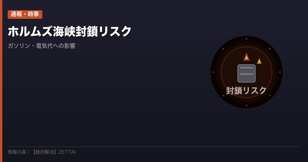2026年3月、米国・イスラエルによるイラン攻撃を受けてホルムズ海峡が事実上の封鎖状態に。日本の原油輸入の約94%が中東に依存しているいま、「オイルショック級」の家計直撃が現実味を帯びています。
