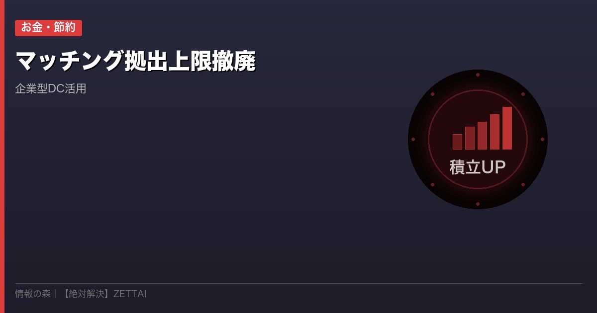 この記事では、マッチング拠出上限撤廃の具体的な内容・節税効果の計算方法・活用すべき人の特徴まで、老後資産を最大化するための情報をお届けします。