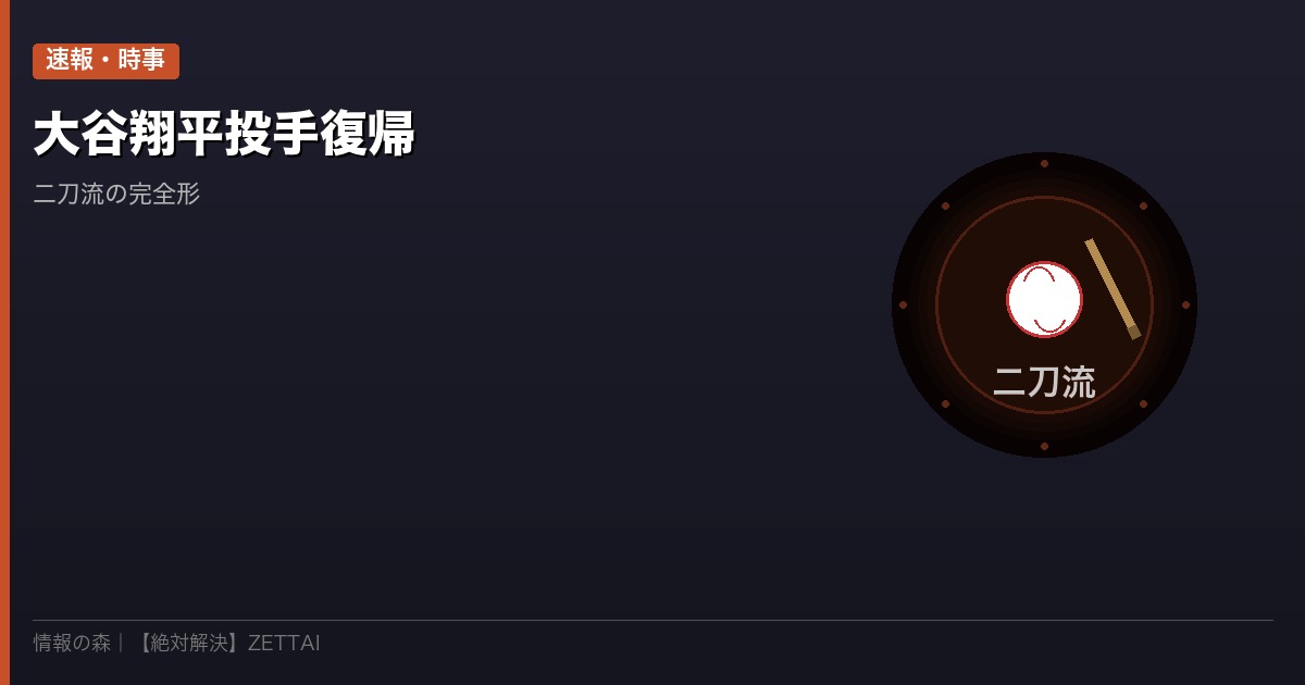 結果は6回1安打無失点で今季初勝利。打者としても3打数1安打2四球と、まさに二刀流の完全形です。この記事では、初登板の球速・球種分析から、2026年シーズンの展望まで徹底解説します。