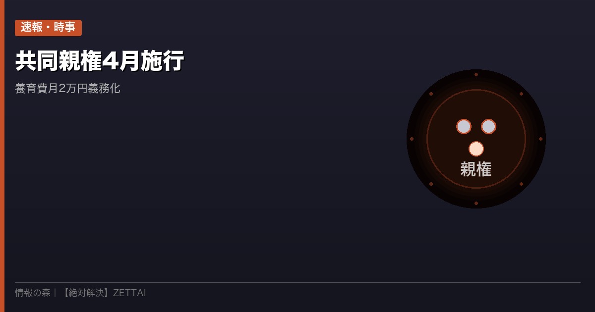 2026年4月1日、改正民法が施行され、共同親権が導入されました。さらに注目すべきは「法定養育費制度」の創設です。取り決めがなくても子ども1人あたり月額2万円の養育費が請求できるようになりました。