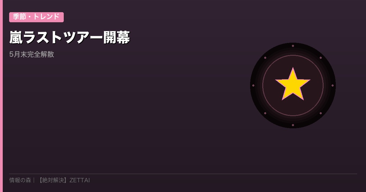 嵐のラストツアーは、日本のエンタメ史に残る歴史的イベントです。5月31日の東京ドーム公演まで、ファン一人ひとりが最後の嵐を見届ける時間が続きます。「ずっとファン」という言葉に込められた想いを胸に、ラストまで駆け抜ける嵐を応援しましょう。