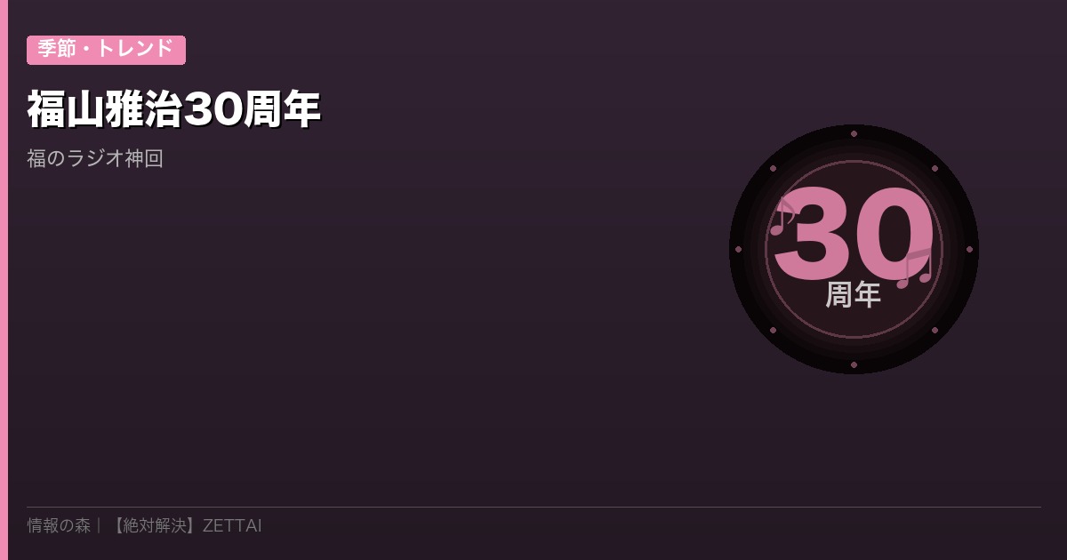 1996年にTOKYO FM/JFNでスタートした『福山雅治 福のラジオ』が、2026年で放送開始30年目を迎えます。30周年を祝うタイミングで、歴代の「神回」をファン目線で振り返りたいと思います。
