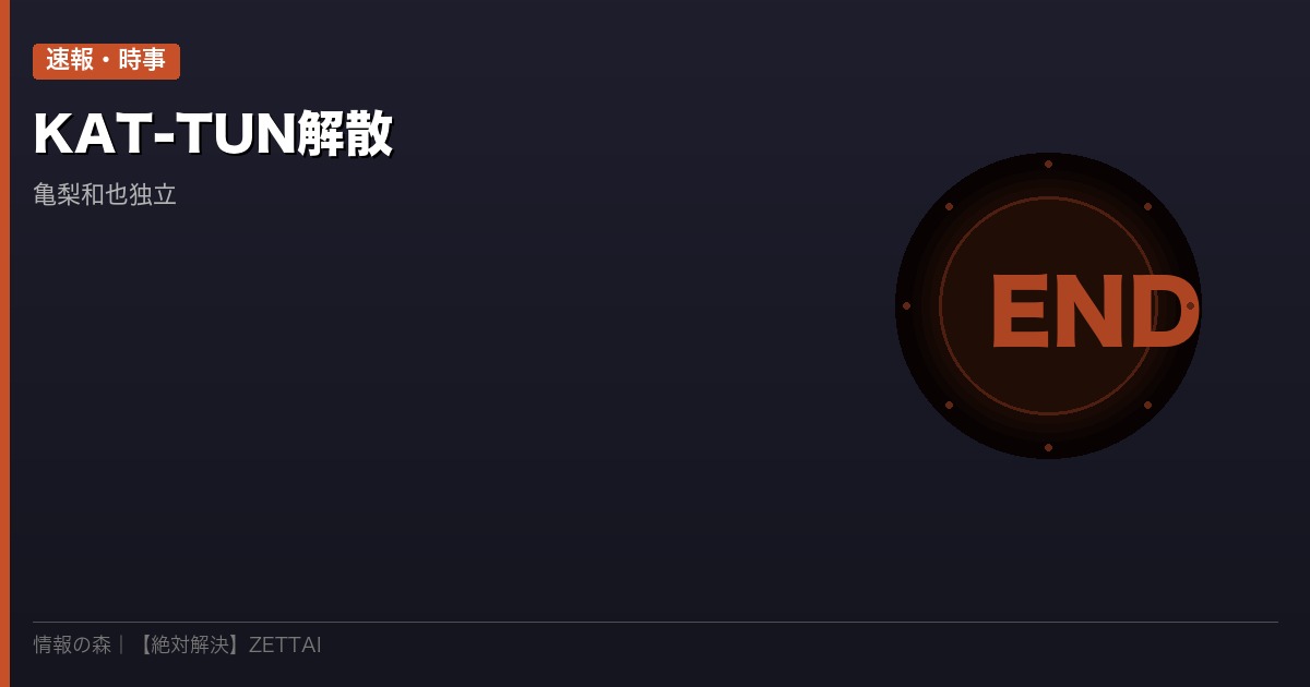 「まさかのKAT-TUN解散、そして亀梨和也の独立――」2026年、エンタメ界を揺るがす大きなニュースが続いています。KAT-TUNが3月末で解散し、亀梨和也さんがSTARTO ENTERTAINMENTを退所して独立することが報じられました。