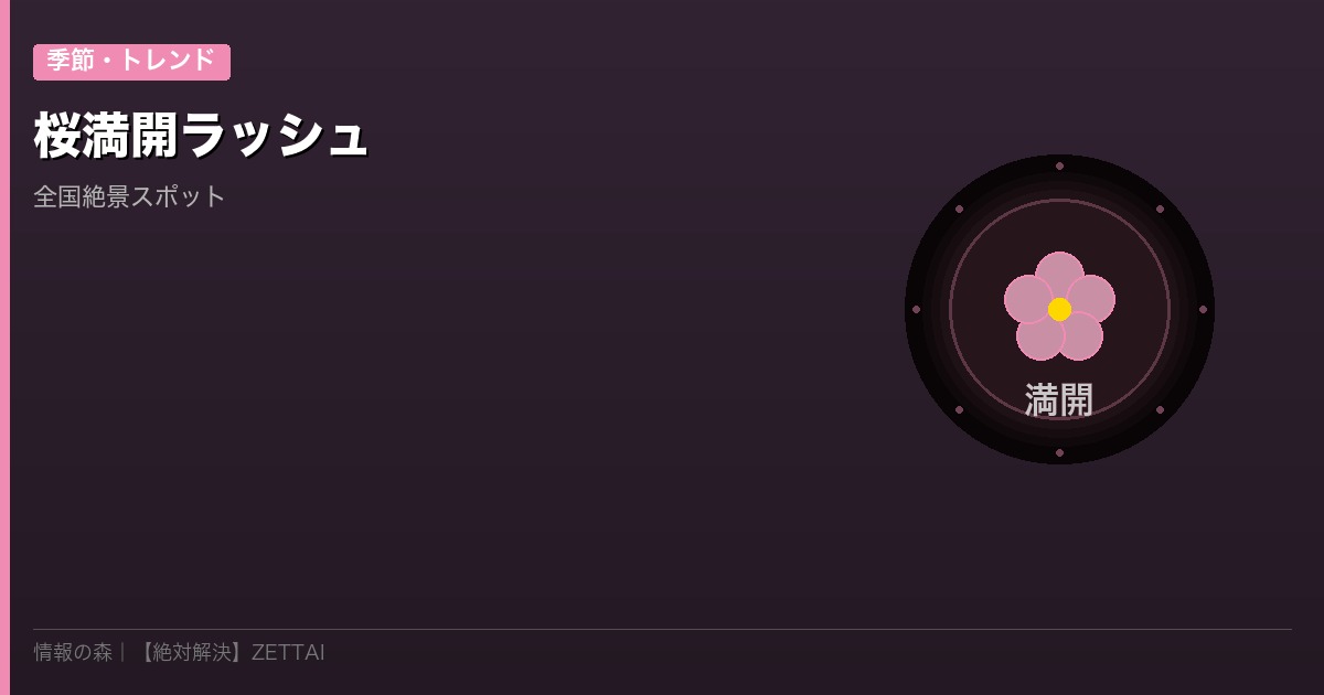 この記事では、4月4日時点の最新満開情報、全国の見頃マップ、今週末に行くべきお花見スポットまで、お花見計画に必要な情報を全てまとめました。桜は一瞬。後悔しない週末を過ごしましょう。