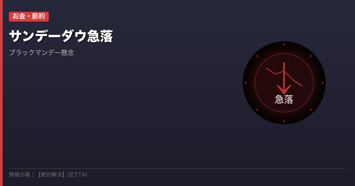 この記事では、サンデーダウ下落の経緯、過去のブラックマンデー比較、そしてあなたの資産を守る防衛戦略を解説します。最後まで読めば、月曜の朝を落ち着いて迎えられる備えができます。