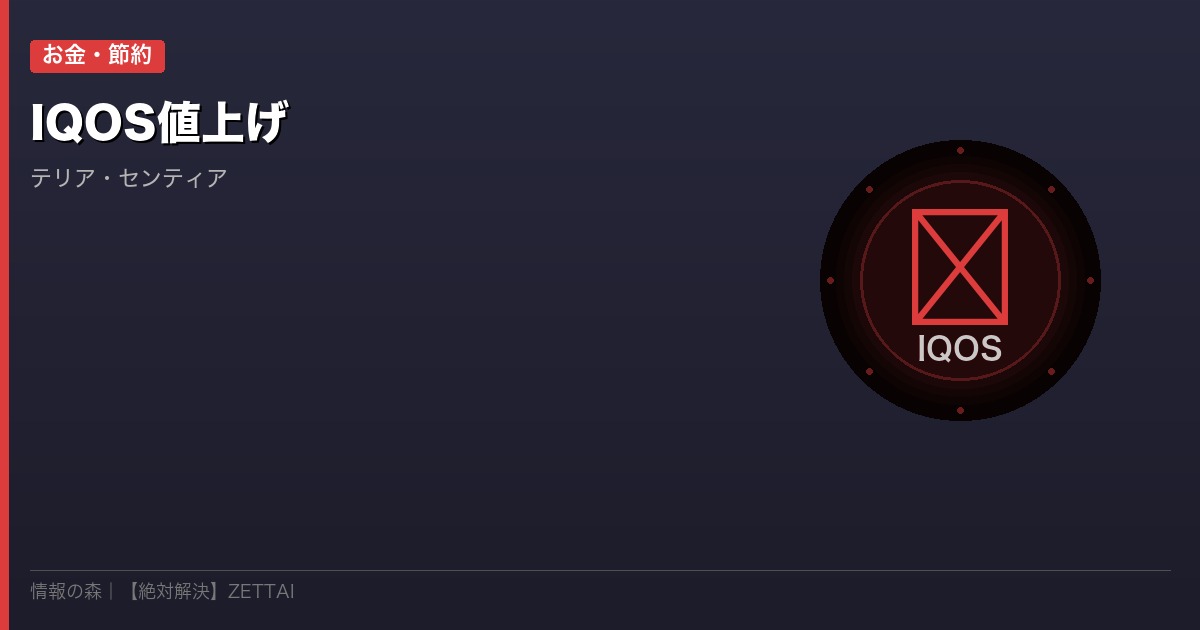 2026年4月1日から、加熱式たばこIQOSの主要銘柄が一斉に値上げされました。テリア27銘柄が580円から620円へ、センティア19銘柄が530円から570円へ。1箱あたり40〜50円の値上げは、年間で計算すると相当な負担です。